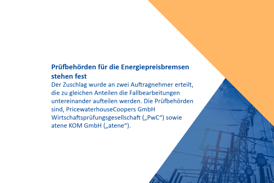 Prüfbehörden für die Energiepreisbremsen stehen fest Das Vergabeverfahren für eine Prüfbehörde für die Energiepreisbremsen wurde abgeschlossen. Der Zuschlag wurde an zwei Auftragnehmer erteilt, die zu gleichen Anteilen die Fallbearbeitungen untereinander aufteilen werden. Die Prüfbehörden sind, PricewaterhouseCoopers GmbH Wirtschaftsprüfungsgesellschaft („PwC“) sowie atene KOM GmbH („atene“). Beide Gesellschaften sollen zu gleichen Anteilen, jedoch mit unterschiedlichen Schwerpunkten, in…