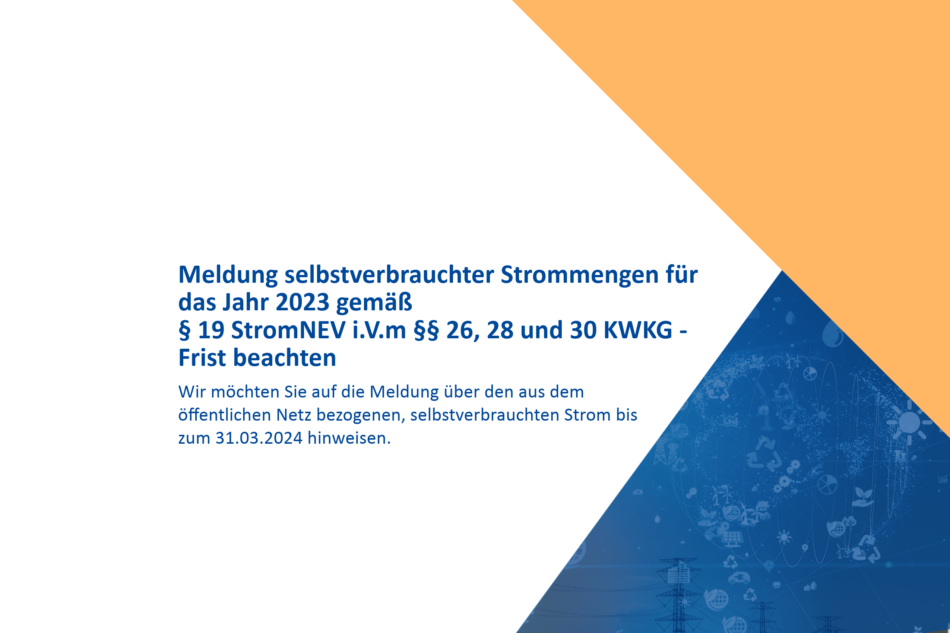 Meldung selbstverbrauchter Strommengen für das Jahr 2023 gemäß § 19 StromNEV i.V.m §§ 26, 28 und 30 KWKG – Frist beachten Wir möchten Sie auf die Meldung über den aus dem öffentlichen Netz bezogenen, selbstverbrauchten Strom bis zum 31.03.2024 hinweisen. Was ist zu tun? Alle Kunden mit einem Verbrauch über 1.000.000 kWh (= 1 GWh/a…