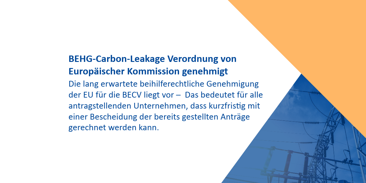 Die Brennstoffemissionshandel-Carbon-Leakage-Verordnung (BECV) wurde im Jahr 2021 als Instrument zur Entlastung besonders im internationalen Wettbewerb stehender Unternehmen in Kraft gesetzt. In diesem Rahmen konnten Unternehmen aus beihilfeberechtigten (Teil-)Sektoren zum 30. Juni 2022 die Zahlung einer Beihilfe zur Entlastung von den CO2-Kosten beantragen. Viele der Unternehmen, die bereits für die Abrechnungsjahre 2021 und 2022 ihre Anträge auf Entlastung gestellt haben, erhielten bislang keine Entscheidung der DEHSt. Diese begründete die mit der noch fehlenden beihilferechtlichen Genehmigung der EU.