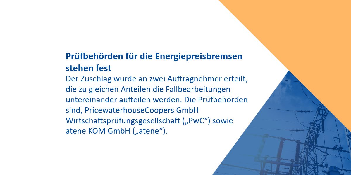 Das Vergabeverfahren für eine Prüfbehörde für die Energiepreisbremsen wurde abgeschlossen. Der Zuschlag wurde an zwei Auftragnehmer erteilt, die zu gleichen Anteilen die Fallbearbeitungen untereinander aufteilen werden. Die Prüfbehörden sind, PricewaterhouseCoopers GmbH Wirtschaftsprüfungsgesellschaft („PwC“) sowie atene KOM GmbH („atene“). Beide Gesellschaften sollen zu gleichen Anteilen, jedoch mit unterschiedlichen Schwerpunkten, in die Bearbeitung eingebunden werden. PwC wurde zuvor bereits mit der Abwicklung der Dezember-Soforthilfe nach dem Erdgas-Wärme-Soforthilfe-Gesetz (EWSG) sowie mit der Prüfung der Vorauszahlungsanträge der Erdgaslieferanten und Wärmeversorgungsunternehmen im Rahmen des Erdgas-Wärme-Preisbremsengesetzes (EWPBG) beauftragt.